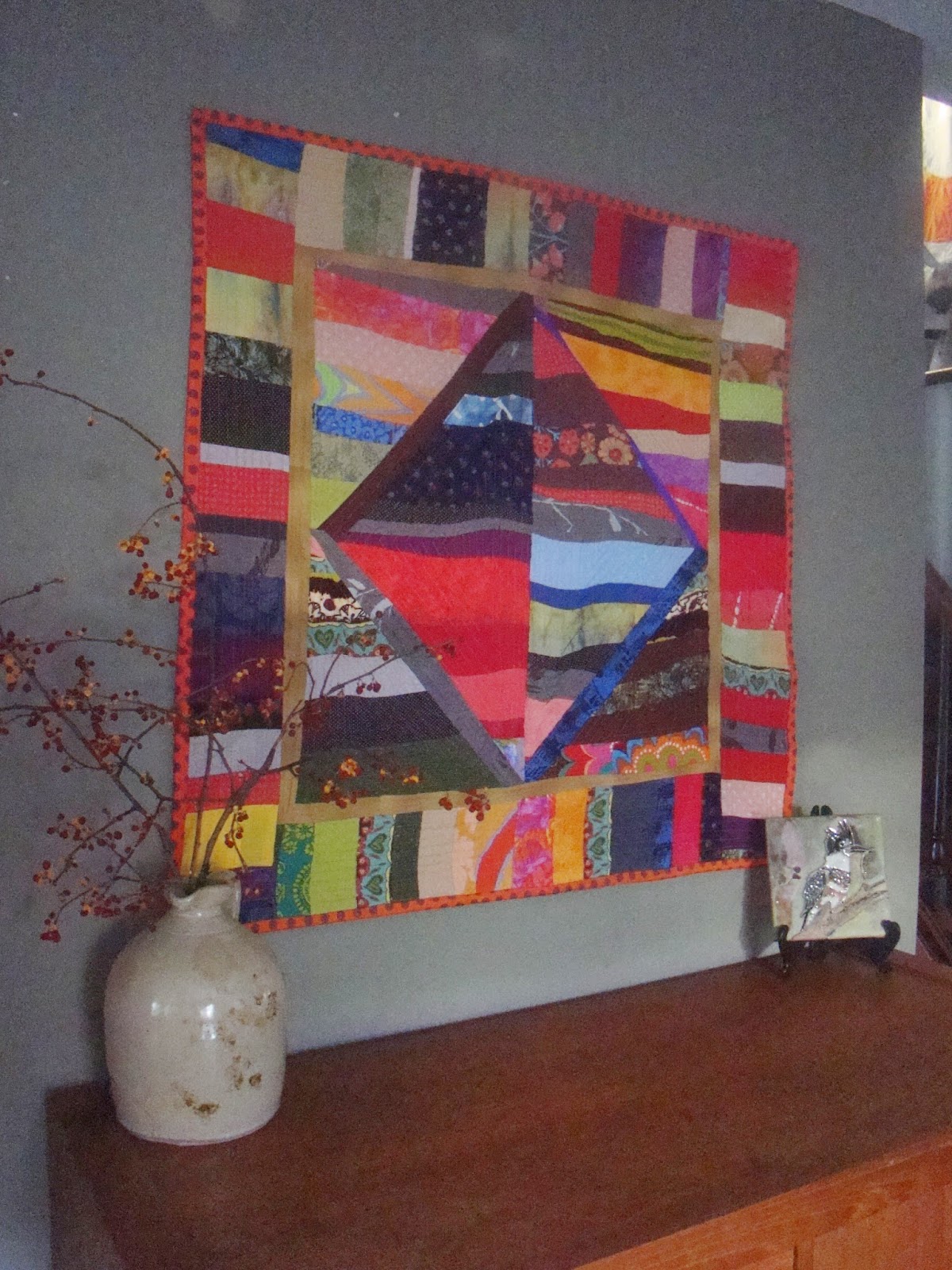 Here are two more pics of quilt porn. One of the quilt on the wall and one of it bundled up with my ADORABLE bird scissors on top. Geeking out here.